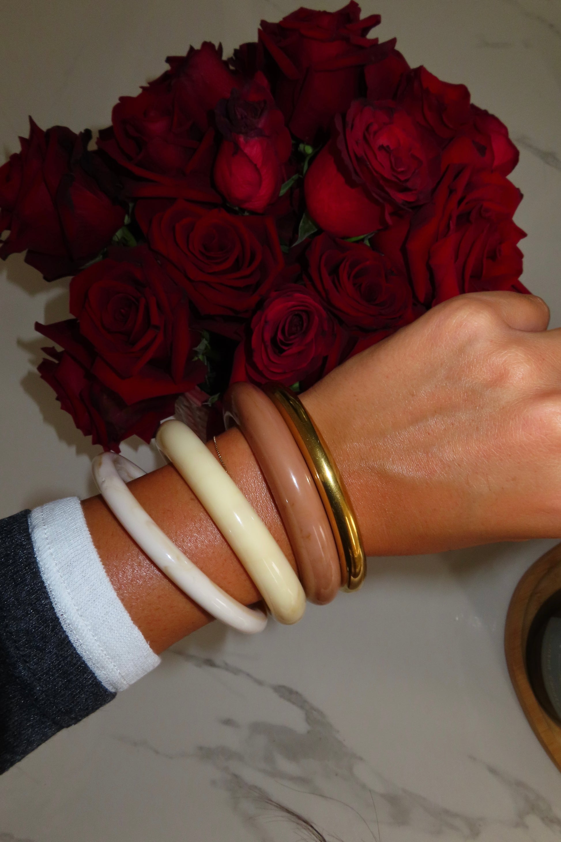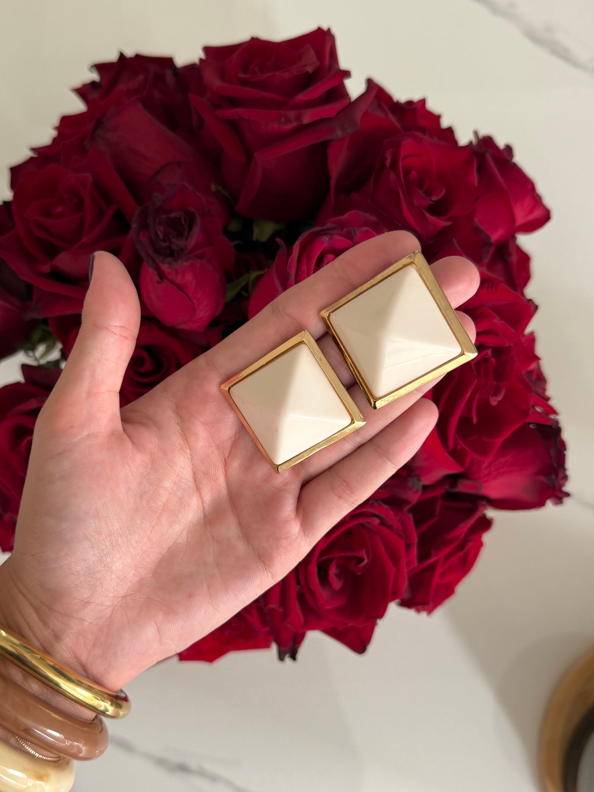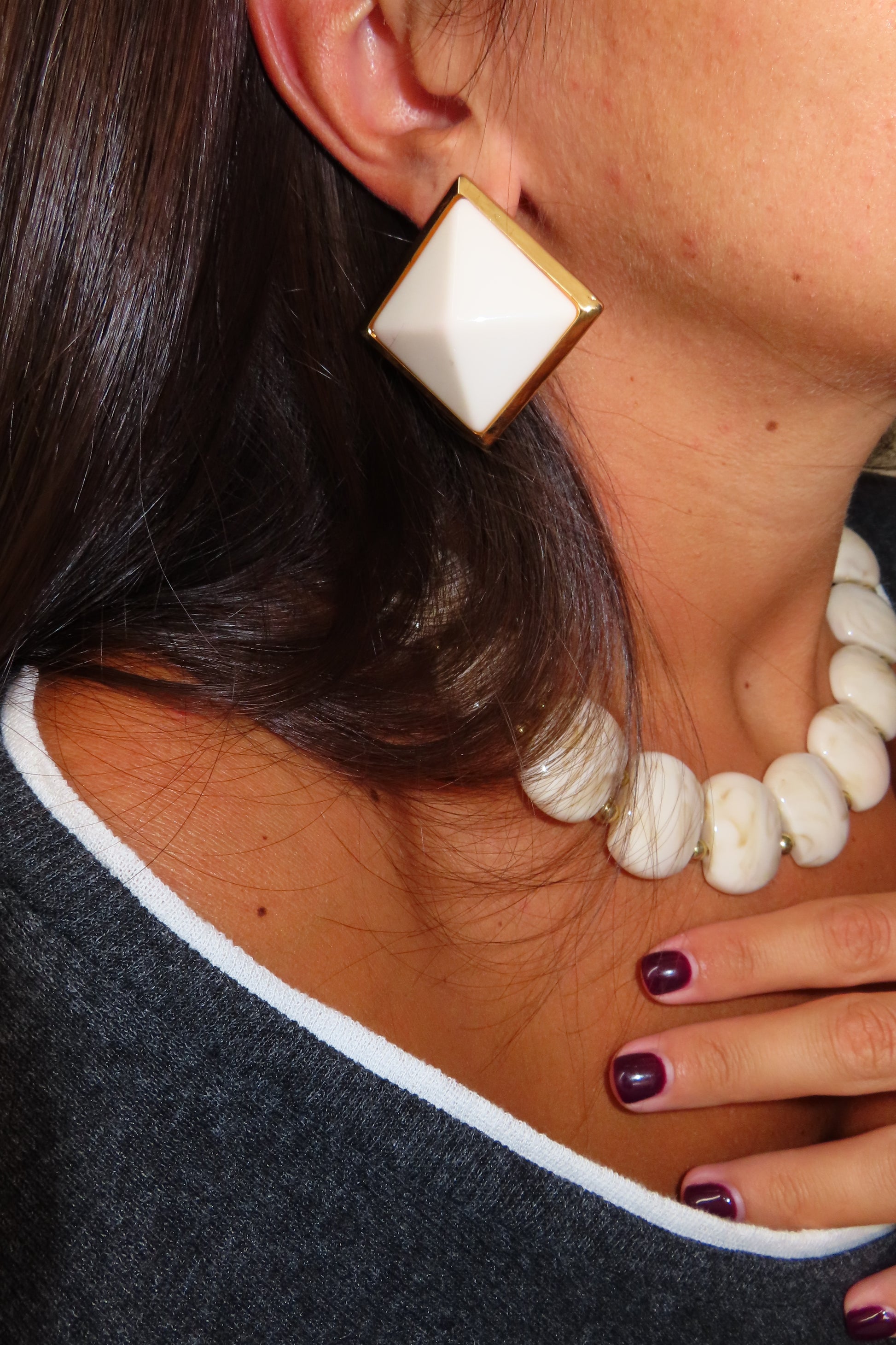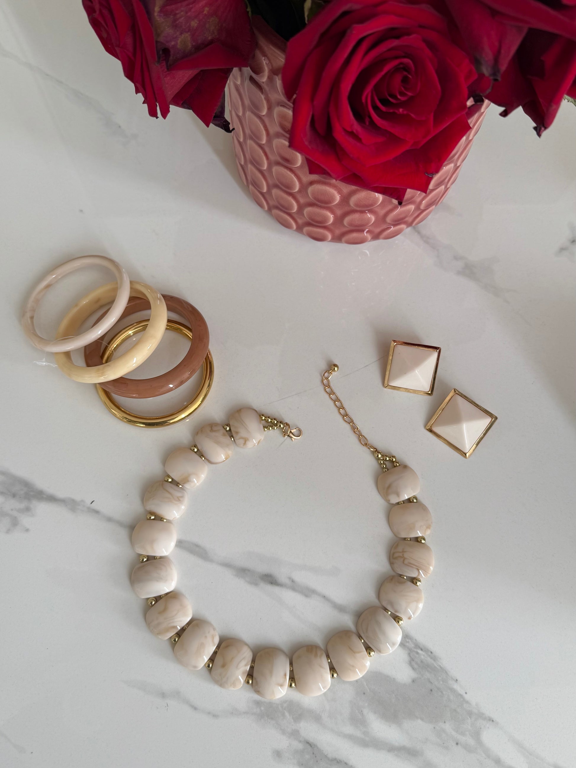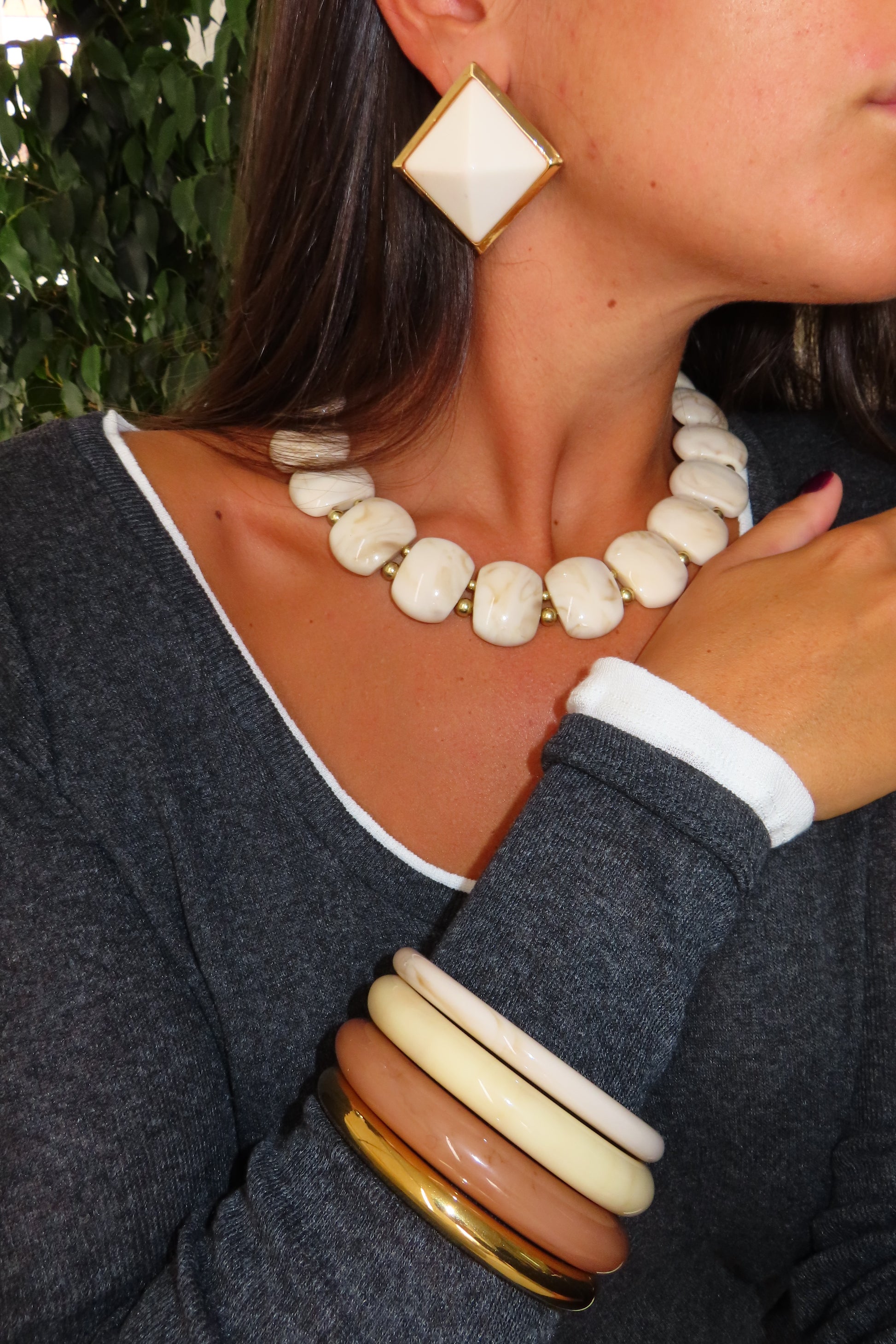 Il set di gioielli comprende una coppia di orecchini, una collana ed una serie di bracciali rigidi. Tutti gli accessori sono caratterizzati da nuance calde come l’avorio e l’oro, che creano un look sofisticato e perfetto per il clima autunnale.